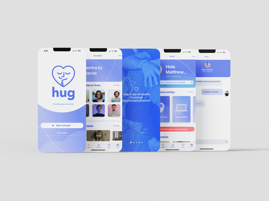 Hug is an emotional support application developed as part of the UX/UI Principles Diploma program at Coder House in 2022. The project began with comprehensive UX research and user testing, culminating in the creation of a functional prototype. Additionally, the entire brand identity was developed, including the visual language for the app, such as icons and a cohesive color palette.