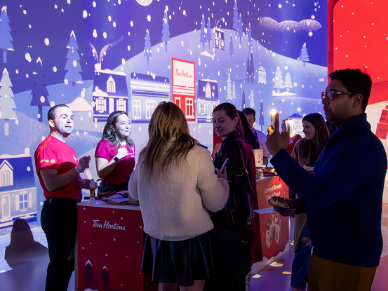In 2024, Tim Hortons decided to host a fully immersive event as part of their holiday activation and the launch of their product line in collaboration with Bailey's. On this occasion, I had the honor of serving as the lead graphic designer. My work involved the complete design of game interfaces, as well as the visual composition of the spaces, including backgrounds, signage, photo ops, and other elements.